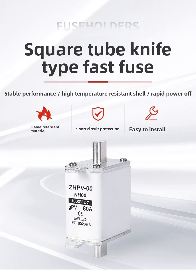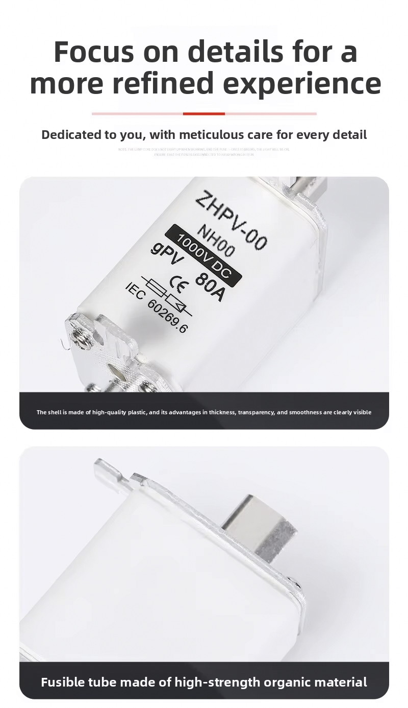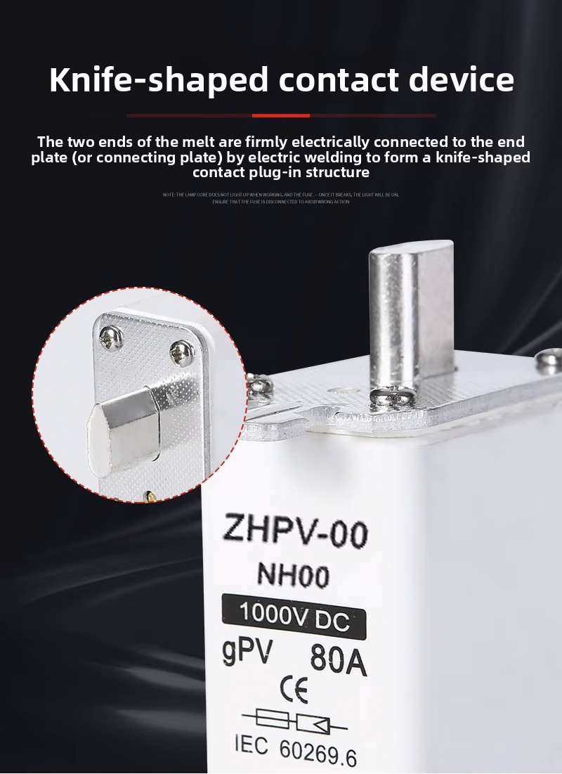 El fusible de cuchilla fotovoltaico de bajo voltaje IEC NH00-1000V de plástico con capacidad de ruptura de 80 A y 6 ka está diseñado para una protección de circuitos eficiente y confiable en sistemas fotovoltaicos y otras aplicaciones de bajo voltaje. Este fusible de alta calidad funciona hasta 1000 V, con una robusta capacidad de corte de 6 ka, lo que garantiza una desconexión segura en caso de sobrecargas o cortocircuitos. Su corriente nominal de 80A lo hace adecuado para diversas instalaciones fotovoltaicas y paneles de control industriales.