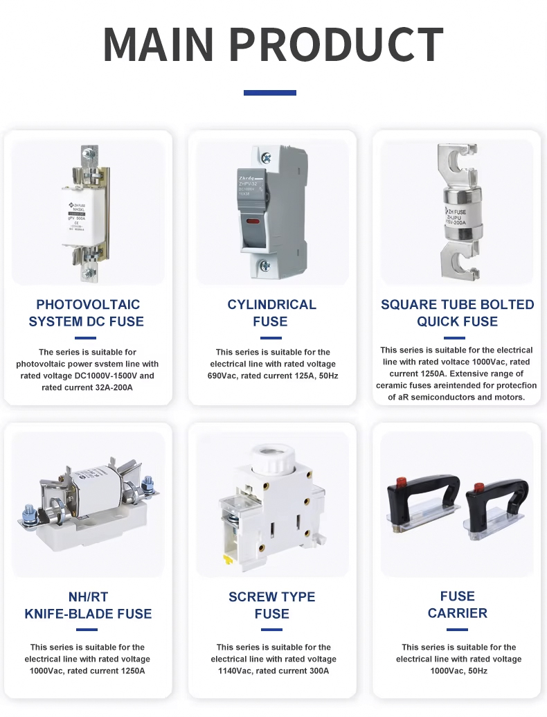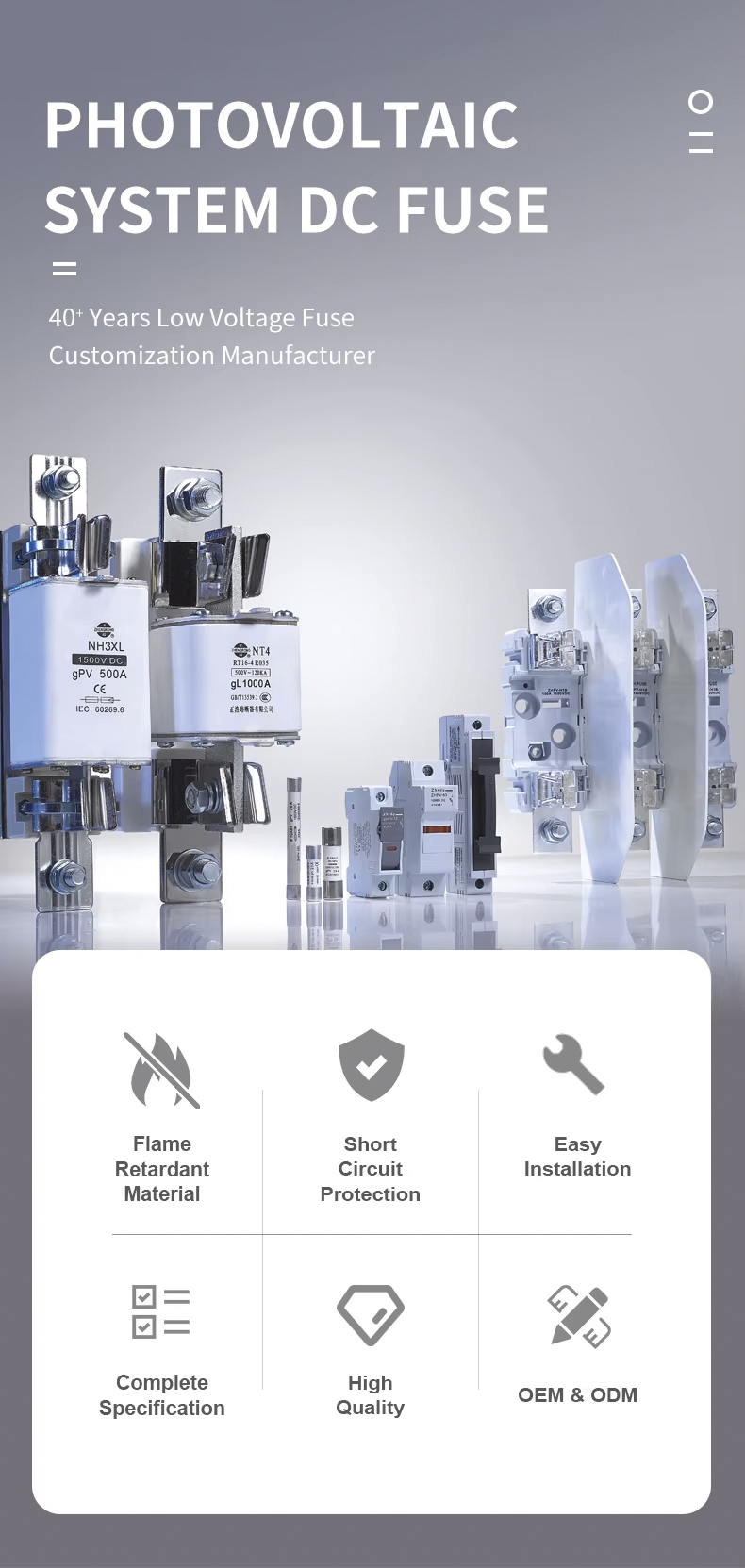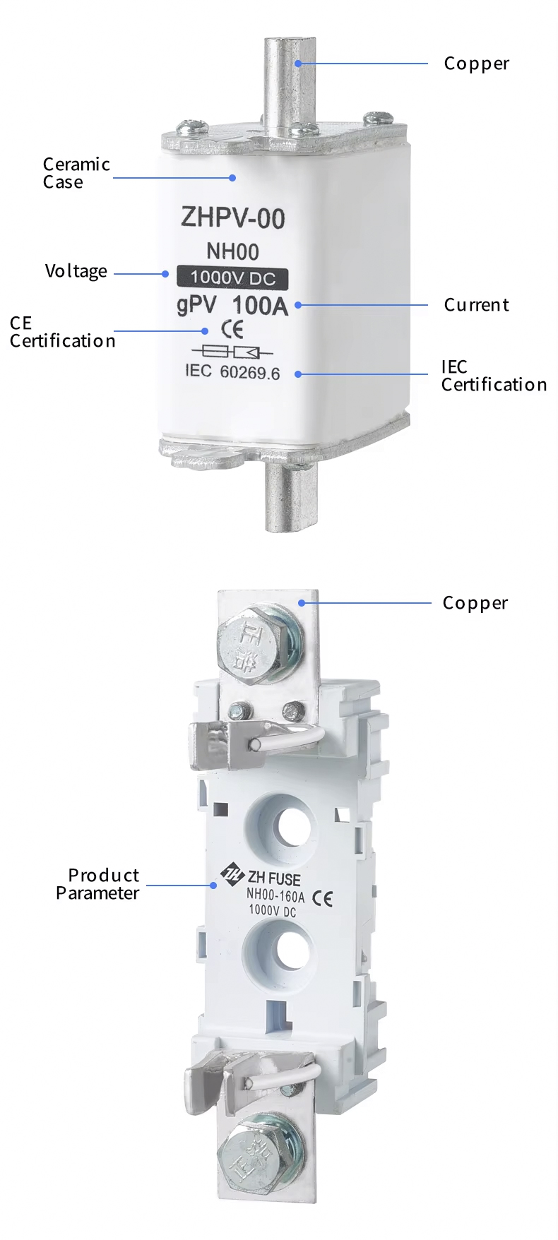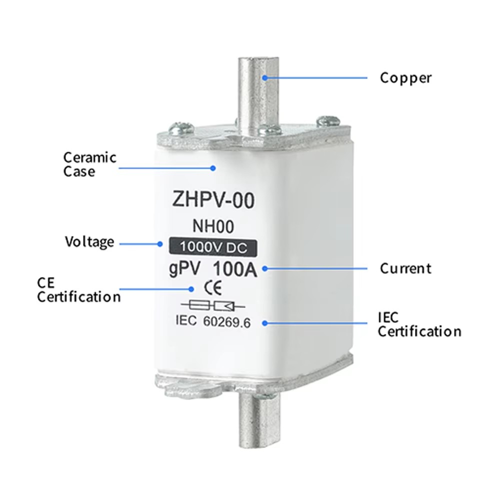 Sistema fotovoltaico NH00 DC 1000V 32~100A Enlace fusible Se seleccionan materiales de alta calidad para garantizar características de fusible estables y confiables, velocidad de respuesta rápida y alta seguridad. De apariencia compacta, fácil de instalar, ampliamente utilizado en diversos sistemas, como cajas de combinación fotovoltaica, inversores y gabinetes de distribución de CC. El enlace fusible del sistema fotovoltaico NH00 CC 1000 V 32 ~ 100 A ha pasado múltiples certificaciones internacionales y cumple con los estándares IEC, lo que lo convierte en una opción ideal para garantizar el funcionamiento seguro de los sistemas de plantas de energía.
