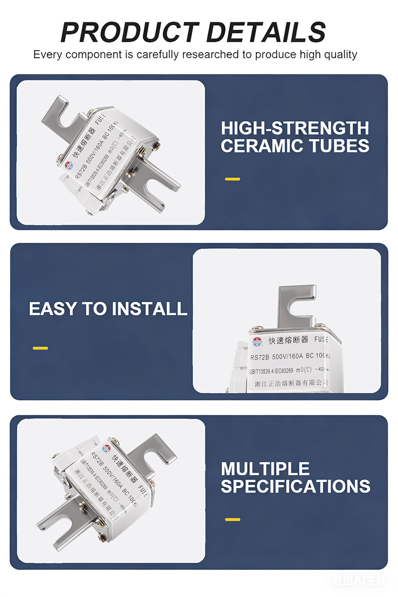 Este producto es adecuado para aplicaciones como sistemas de energía, gabinetes de distribución, transformadores, etc., garantizando el funcionamiento seguro de los circuitos. Los cartuchos fusibles RS72B 500V 160A BC 100KA tienen características de respuesta rápida y pueden cortar rápidamente la corriente en caso de falla, protegiendo el equipo aguas abajo. Su voltaje nominal es de 500 V y su corriente nominal es de 160 A, lo que cumple con los estándares internacionales. Fácil de instalar y mantener, adecuado para diversas aplicaciones industriales. Los enlaces fusibles RS72B 500V 160A BC 100KA han ganado el reconocimiento de numerosos usuarios por su rendimiento estable y confiable, lo que los convierte en una opción ideal para garantizar la seguridad de los sistemas de energía.