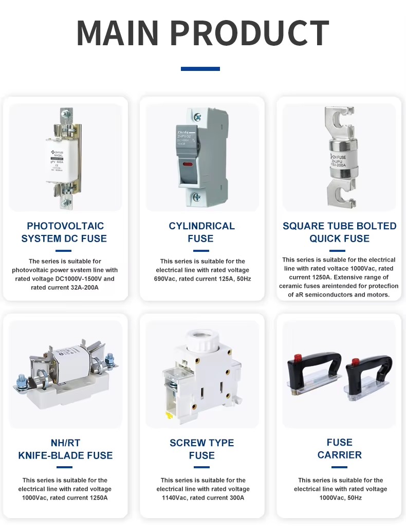 Las características estructurales de la base de fusibles y fusible ZHPV-125 1000V CC y los enlaces de fusibles son los siguientes 22 × 58 mm de fusible de cerámica cilíndrica en el sistema fotovoltaico. Esta serie de fusibles consiste en un enlace de fusible y un titular de fusibles. El cuerpo de fusibles de sección transversal variable hecho de lámina de cobre pura (o alambre de cobre, alambre de plata, lámina de plata) se sella en un tubo de fusible hecho de tubo de tela de vidrio de cerámica o epoxi de alta resistencia, llena de arena de cuarzo de alta pureza tratada químicamente como un medio de extinción de arco. Los dos lados del núcleo del fusible están conectados de manera confiable a la placa final a través de la soldadura por puntos, formando una estructura en forma de tapa cilíndrica. La base de fusibles CC ZHPV-125 1000V DC está hecha de resina o carcasa de plástico presionada con descarga eléctrica, incluido un elemento de fusible, que está conectado por remachado como soporte para el componente del cuerpo del fusible de tamaño apropiado. Esta serie de fusibles tiene las ventajas del pequeño volumen, la instalación fácil, el uso seguro y la hermosa apariencia.